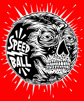 On a lighter, more successful note from the last post, this drawing I did for a friend's new musical venture was able to hurtle through cyber-space and arrive at its intended destination without any unforeseen hiccups, and (I imagine) it will achieve its visual destiny by promoting the good, solid name of Speedball.